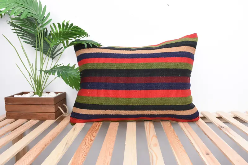 Green & Red Striped Throw Pillow, Embroidered Vintage Cushion