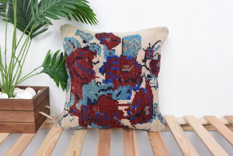 Red & Bronze Embroidered Throw Pillow, 16x16 Vintage Cushion