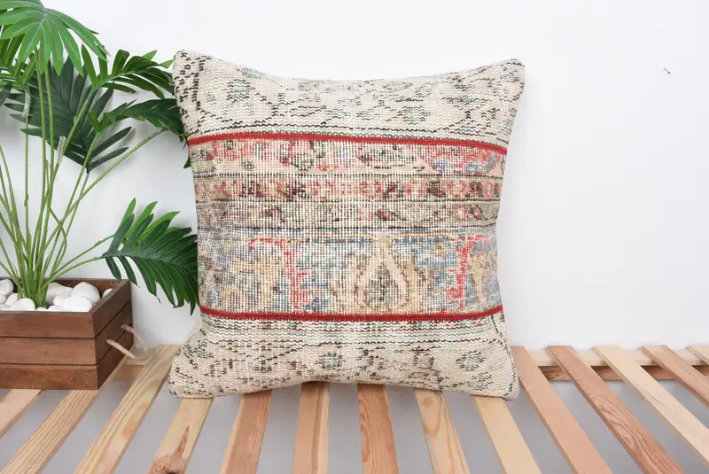 Beige & Red Patchwork Throw Pillow, Vintage Embroidered Cushion