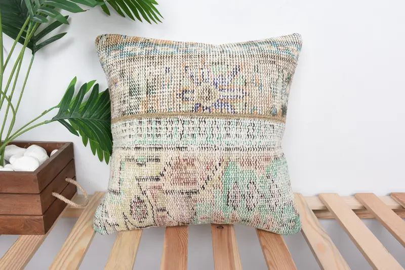 Beige & Bronze Patchwork Throw Pillow, Embroidered Vintage Cushion