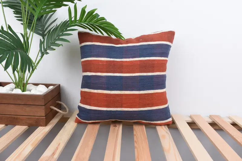 Blue and Red Striped Throw Pillow, Vintage Embroidered Cushion