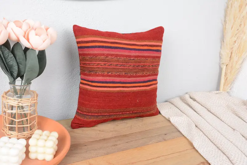 Red & Brown Striped Throw Pillow, Vintage Embroidered Cushion