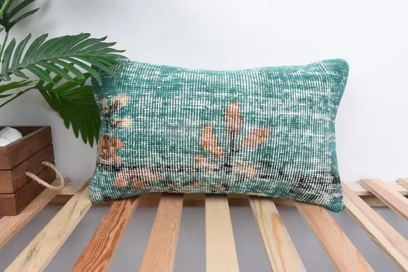 Green & Orange Floral Throw Pillow, 12x20 Vintage Cushion