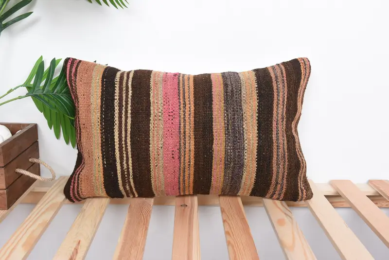 Brown & Pink Striped Pillow, 12x20 Embroidered Throw Pillow