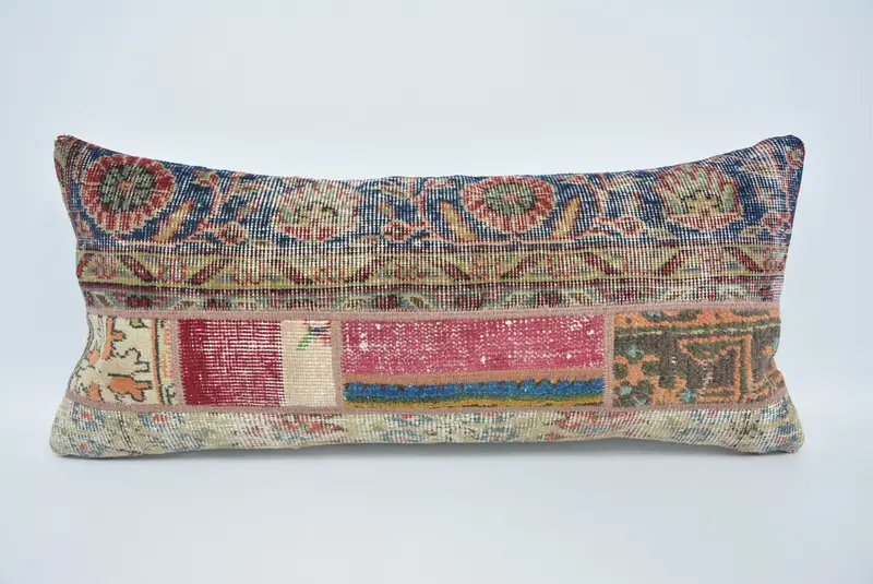 Blue & Pink Embroidered Hemp Throw Pillow, Vintage Square Pillow