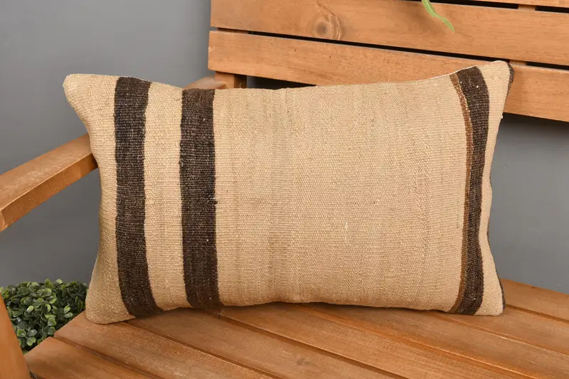 Handmade Embroidered Throw Pillow, Beige & Brown Striped Cushion