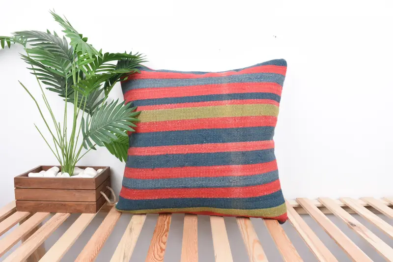 Blue & Red Striped Throw Pillow, Embroidered Vintage Pillow