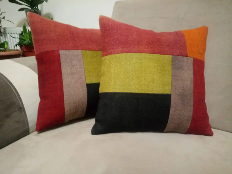 Handcrafted Wool Throw Pillow with Embroidered Patchwork, Vintage Zippered Cushion
