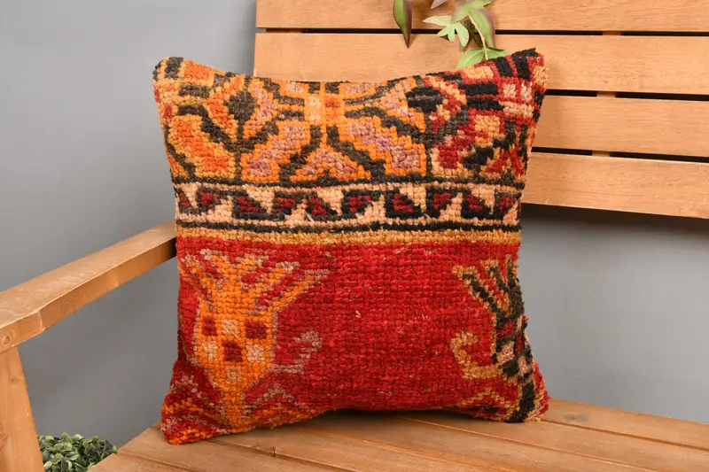 Red & Orange Embroidered Throw Pillow, Vintage Floral Cushion
