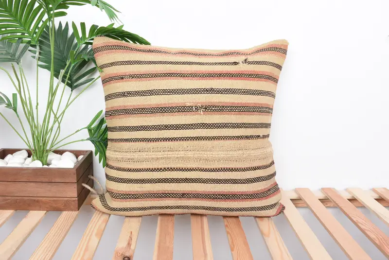Beige & Brown Striped Throw Pillow, Embroidered Vintage Cushion