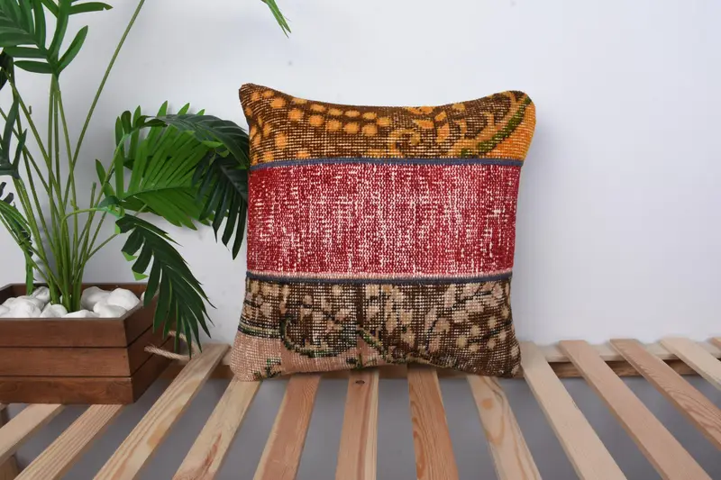 Embroidered Red & Orange Patchwork Throw Pillow, Vintage Handmade Cushion