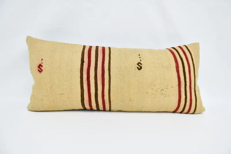 Beige & Red Striped Throw Pillow, Handmade Hemp & Wool Pillow