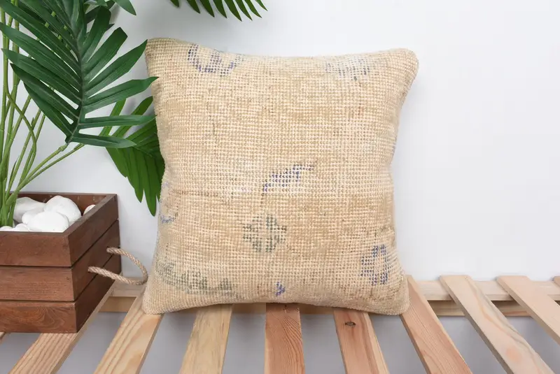 Beige & Brown Floral Throw Pillow, Vintage Embroidered Cushion
