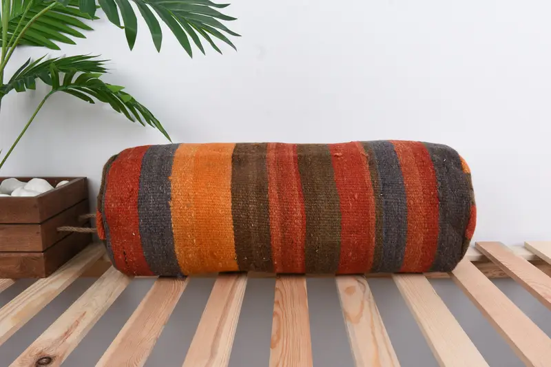 Red & Brown Bohemian Embroidered Wool Pillow, 20x50 Inch Throw Pillow