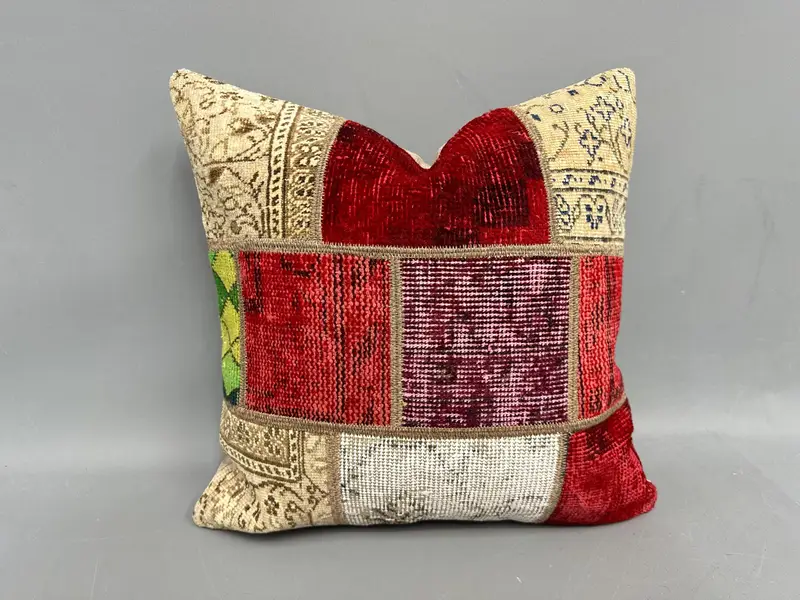 Red & Beige Patchwork Throw Pillow, Embroidered Vintage Cushion