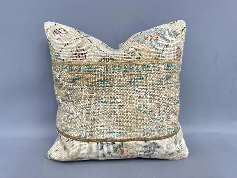 Beige & Brown Patchwork Throw Pillow, Vintage Embroidered Cushion
