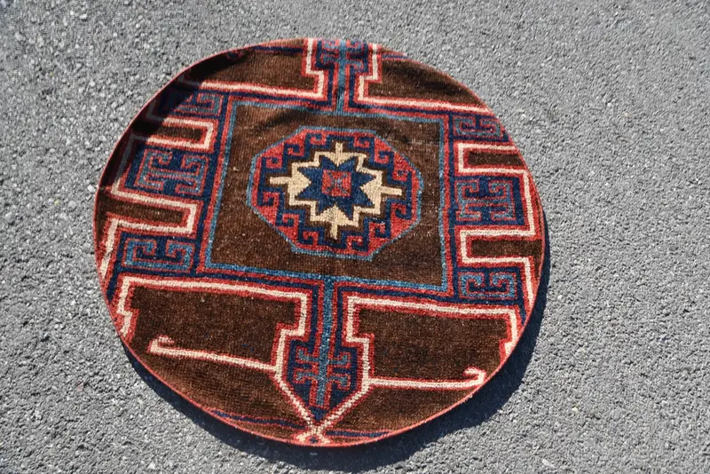 Vintage Turkish Rug, 3,5x3,5 ft Round Rug, Brown Blue Animal Print Wool Rug