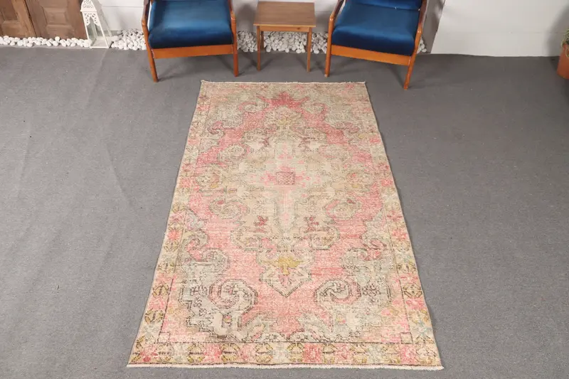 Vintage Turkish Accent Rug 4.3x7.5 ft, Pink Yellow Geometric Rug
