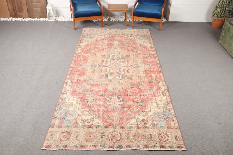 Turkish Vintage Rug, 4.9x10.5 ft Area Rug, Red Rug Geometric with floral elements Rug