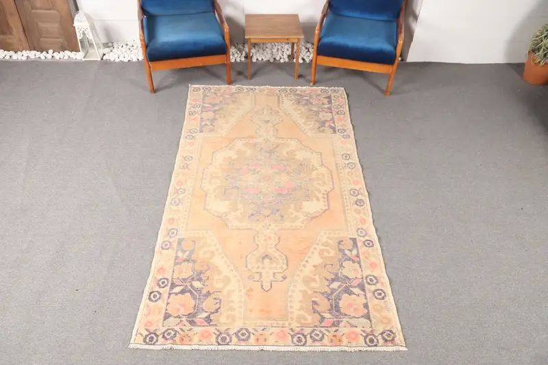 4.1x7.3 ft Accent Vintage Turkish Rug, Orange Geometric with floral elements Rug