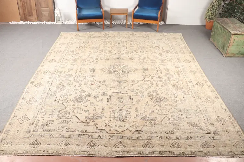 Vintage 9.3x12.1 ft Rug, Oversize Turkish Rug, Beige Brown Geometric Rug