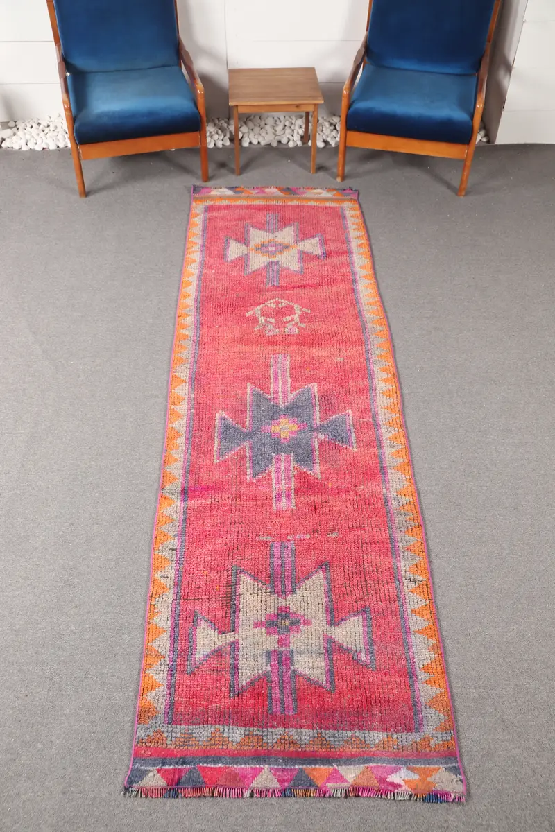 Turkish Vintage Small Rug 2.7x9.6 ft, Pink Orange Geometric Rug