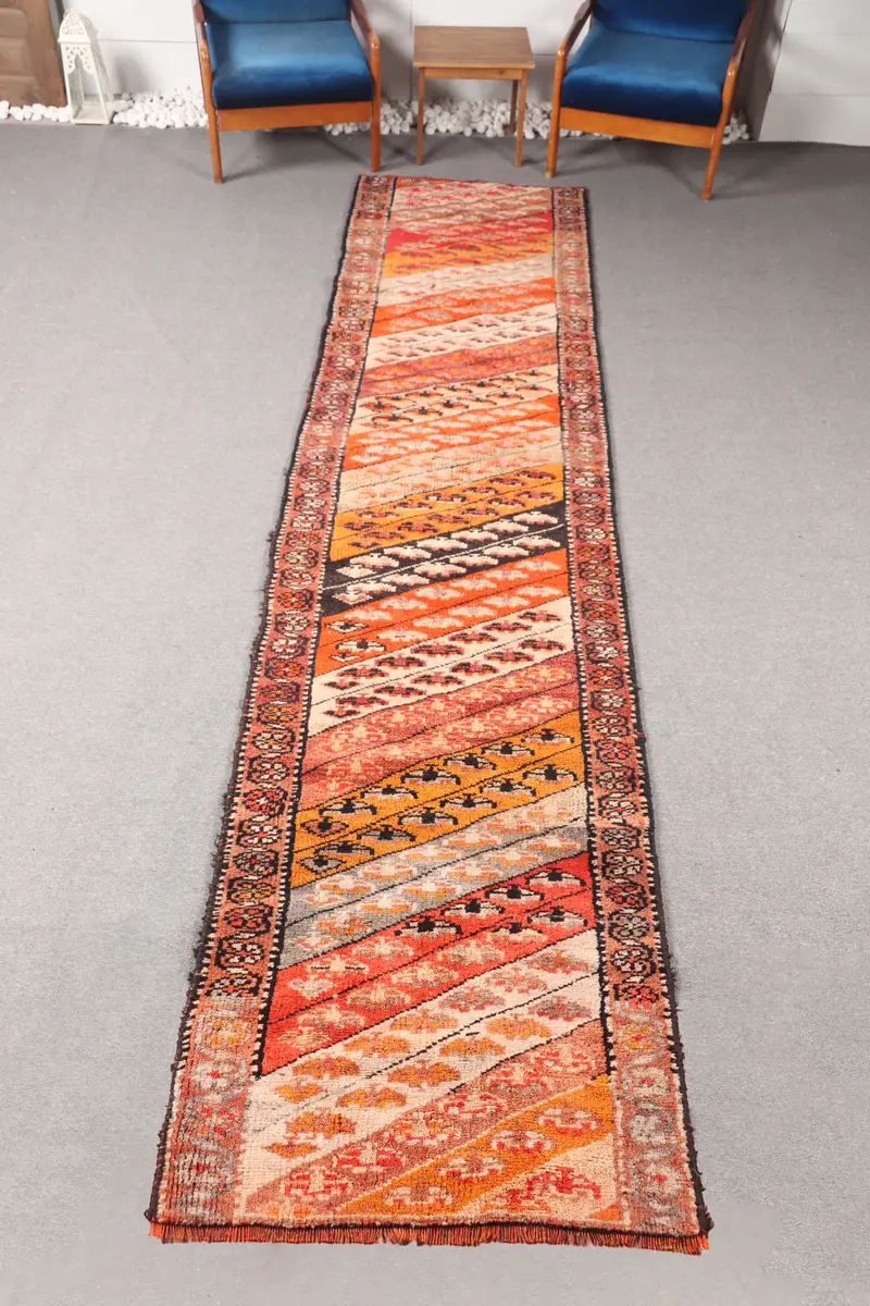 3x12.8 ft Vintage Small Rug, Turkish Brown Geometric with floral elements Rug