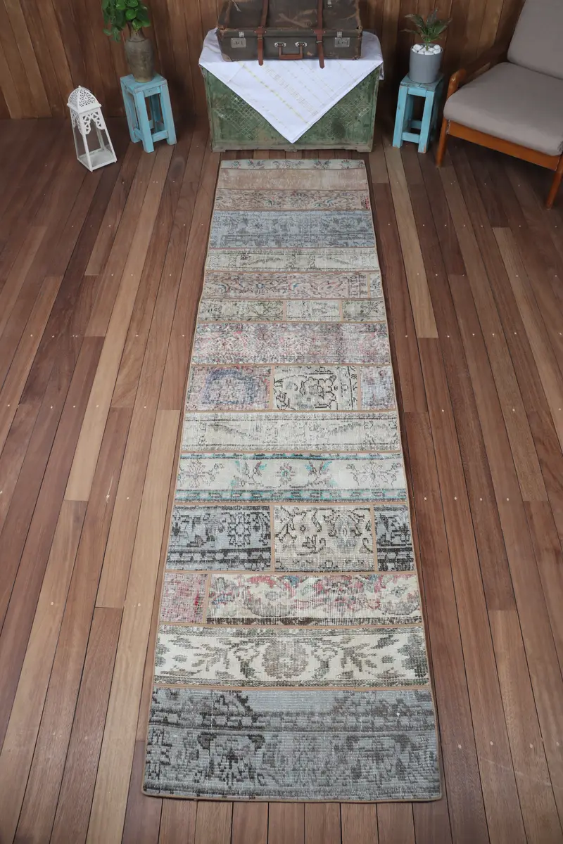 Turkish Rug, Small 2.6x10.2 ft Vintage Rug, Beige Geometric with floral elements Rug