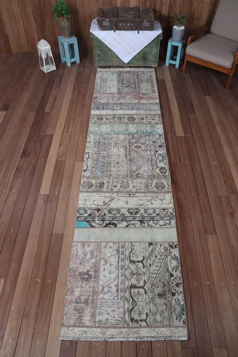 2.6x11 ft Small Vintage Rug, Turkish Rug, Brown Rainbow Geometric with floral elements Rug