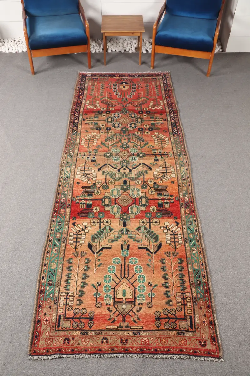 3.4x9.8 ft Vintage Rug, Turkish Small Rug, Orange Geometric Rug