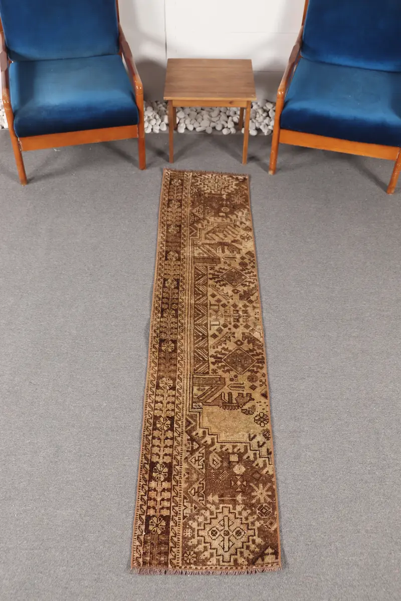 Vintage Turkish Rug, 1.5x7 ft Small Rug, Brown Rug Geometric Rug