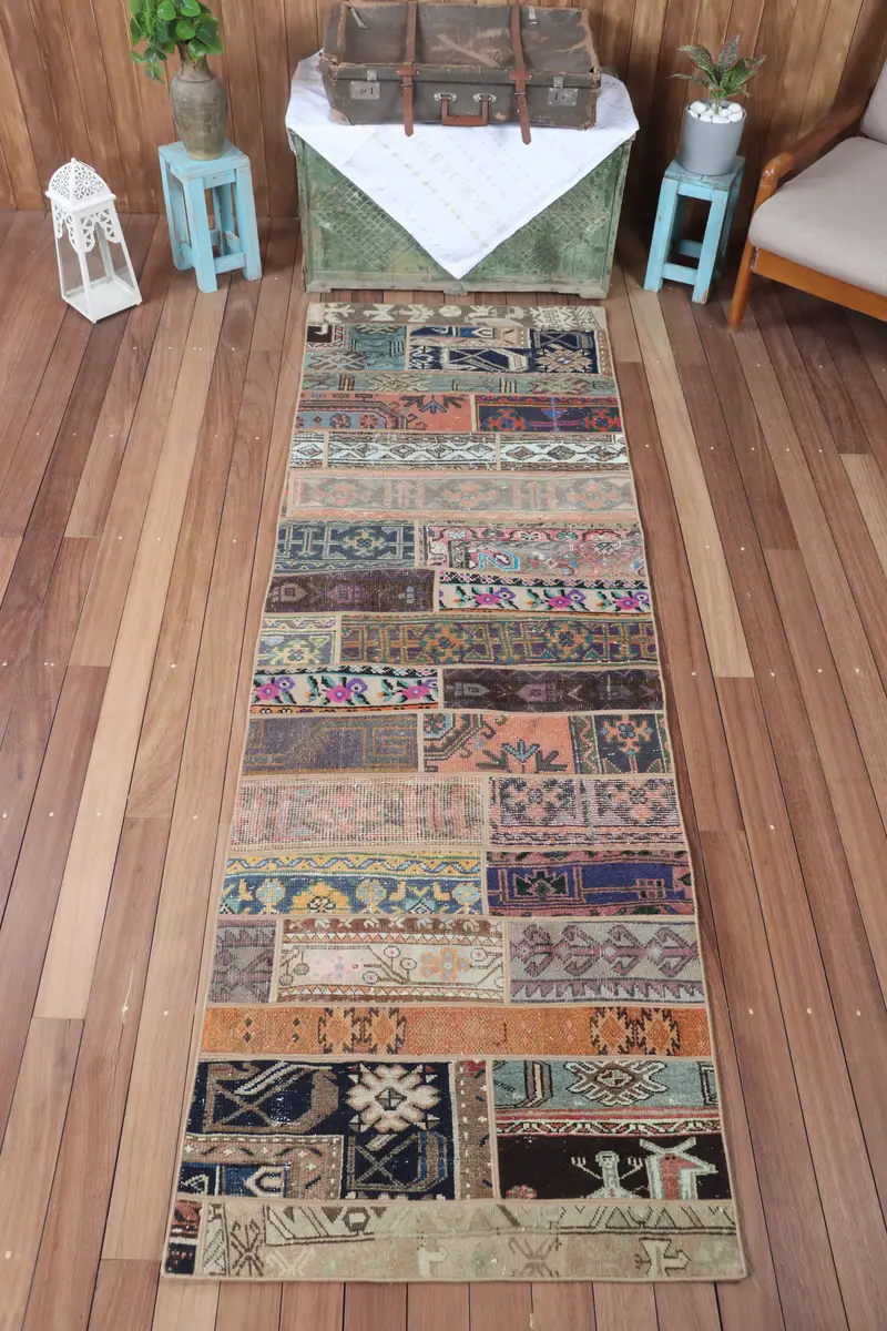 Vintage Turkish Rug, 2.8x8.7 ft Patchwork Rug, Beige Geometric Rug