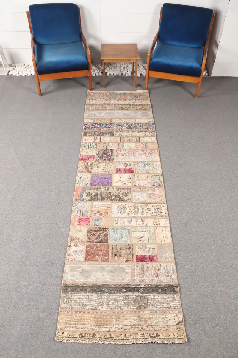 Turkish Vintage Rug, Small 2.6x9.5 ft (78x290 cm) Rug, Beige Floral Rug