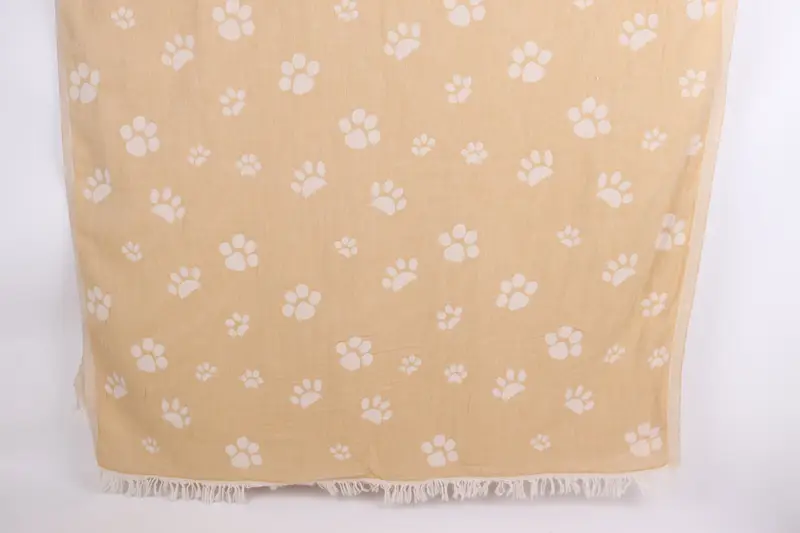The Paw Design Towel is characterized by its material, consisting of 100% organic Turkish cotton. This choice ensures superior absorbency, quick drying, and a sand-free surface, resulting in a highly functional and comfortable towel for various uses. The towels are 70x36 inches or 90x180 cm, weighing 350 grams each, with a tolerance of 1-2.5 cm in size variation, making them versatile for different settings.