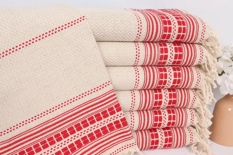 These small towels are characterized by 100% organic Turkish cotton, ensuring superior absorbency and quick drying. Measuring 20x40 inches or 50x100 centimeters, with a weight of 120 grams, they exhibit a hand-weaving tolerance of ±2.5%. The tolerance in size allows customization, providing versatility for various uses such as dish towels, hand towels, and travel towels.