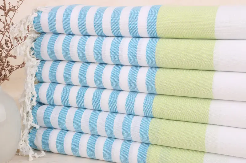 Our collection showcases 100% Organic Turkish Cotton beach towels, ensuring superior softness and quick-drying capabilities. Each towel is woven on hand looms, resulting in precise dimensions of 70x40 inches or 100x180 cm, with a tolerance of 1-2.5 cm due to their handmade nature. The towels weigh 300 grams and are characterized by high absorbency, lightweight, and space-saving features.