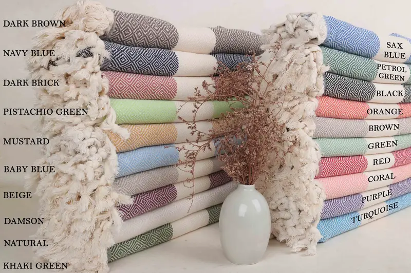 Turkish beach towels, woven from 100% organic Turkish cotton, ensure superior absorbency and comfort. Characterized by hand weaving, these towels exhibit precise dimensions of 40x70 inches or 100x180 cm, weighing 420 grams, and smaller sizes of 20x36 inches or 50x90 cm at 120 grams. Tolerances in size might occur, measuring approximately 1-2.5cm due to hand-weaving.