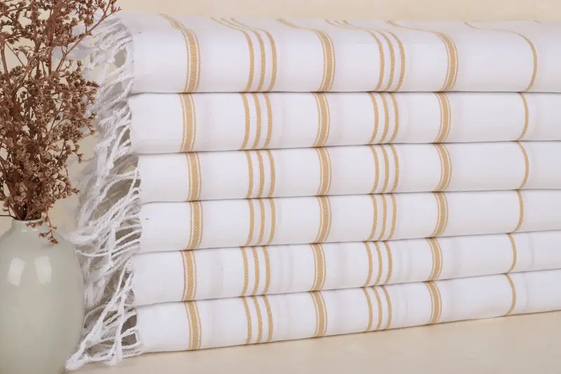 Turkish hand towels are characterized by their %100 Organic Turkish Cotton, ensuring a soft, quick-dry, lightweight, and space-saving texture. Weighing 100 grams, the towels measure 24x40 inches (60x100 cm) with slight variations due to hand-weaving. The absorbent fabric makes them suitable for various uses, such as gym, kitchen, and bathroom towels.