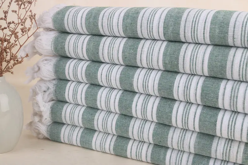 These bath towels are composed of 100% organic Turkish cotton, ensuring superior absorbency and a soft texture. Each towel is 70x40 inches or 100x180 cm, weighing 200 grams. Due to the hand-weaving process, dimensions may vary slightly by up to 1-2.5 cm.