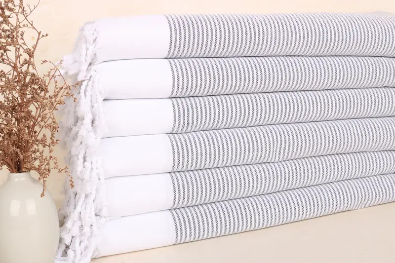 The towels are characterized by their 100% organic Turkish cotton composition, ensuring high absorbency and softness. Weighing 130 grams, these bath towels measure 18x40 inches (45x100 cm) with a manufacturing tolerance of up to 1-2.5 cm. Crafted through hand-weaving techniques, they offer versatility for various applications including gym use, bathroom, kitchen, and tea towels.