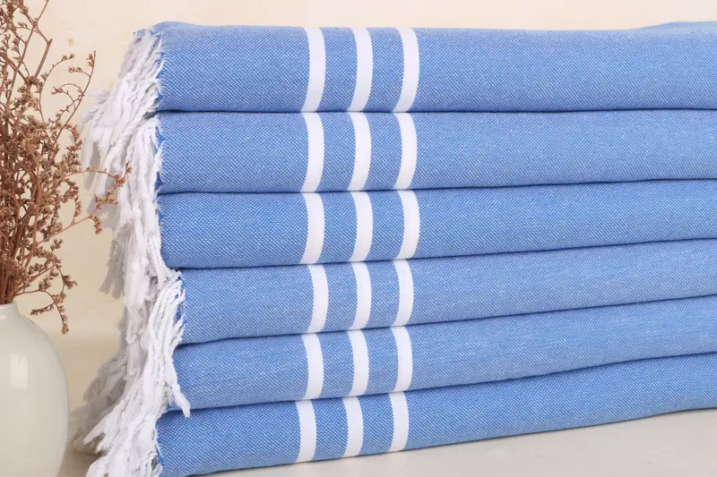 Turkish hand towels, woven meticulously in an atelier, ensure superior softness and quick-dry characteristics. Characterized by 100% organic Turkish cotton, these towels exhibit exceptional absorbency and lightweight properties, resulting in a versatile product. Measuring 40x20 inches or 50x100 cm with a weight of 100 grams, they accommodate a slight variation of 1-2.5 cm due to hand-weaving.