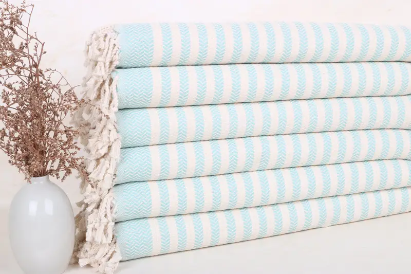 100% Organic Turkish cotton characterizes these towels, ensuring high absorbency and quick drying. Weighing 115 grams, these hand-woven towels measure 18x40 inches (45x100 cm) with a tolerance of 1-2.5 cm. Each piece is pre-shrunk and ready for immediate use, with careful attention to avoid shrinkage post-delivery.