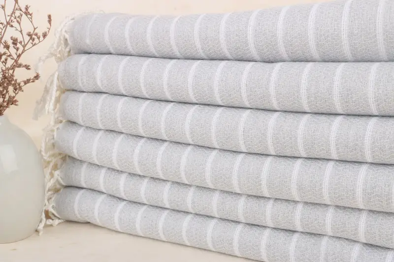 Available in light gray with beige stripes, these towels are suitable for various occasions, including bar and bat mitzvahs, and holidays like Thanksgiving. Their size and lightweight properties make them ideal for diverse uses, from beach outings to yoga sessions.