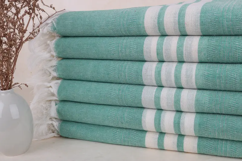Characterized by high-quality, 100% organic Turkish cotton, these towels ensure durability and exceptional absorbency, resulting in a soft and quick-drying texture. Dimensions span 67x40 inches or 100x170 cm, with a tolerance of 1-2.5cm due to hand-weaving, and weigh 200 grams. Pre-shrunk towels guarantee minimal size change upon washing.
