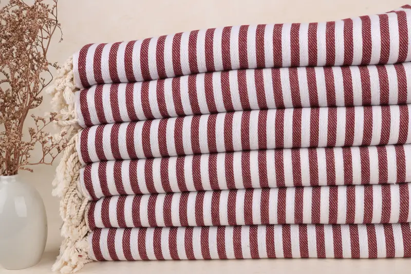 The product is characterized by its 100% organic Turkish cotton composition, ensuring high absorbency and softness, ideal for bath, picnic, and yoga uses. Measuring 70x40 inches or 100x180 cm, with a weight of 298 grams, each piece is handmade which may result in minor dimensional variances within a tolerance of 1-2.5 cm. Customization options include monogramming, logo embroidery, and label sewing, subject to a minimum order of 500 towels.