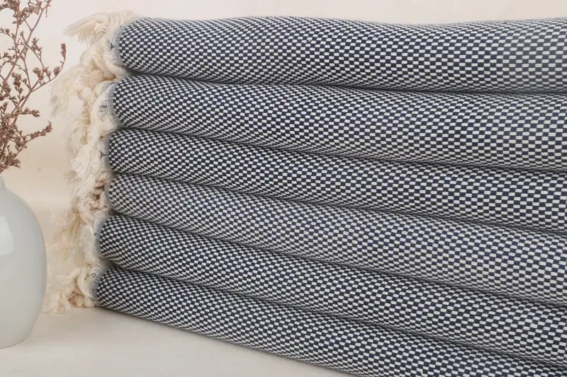 Turkish towels are woven from 100% organic Turkish cotton, ensuring high absorbency and softness. Each towel is meticulously crafted, characterized by dimensions of 70x40 inches or 100x180 cm, with a weight of 460 grams. The hand-weaving process allows for a tolerance of 1-2.5cm in measurements, ensuring a handmade quality.