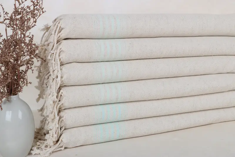 These hand towels are composed of 100% organic Turkish cotton, ensuring superior absorbency and softness. Each towel measures 18x36 inches or 45x90 centimeters, with a weight of 104 grams, providing a lightweight yet functional textile. The hand-weaving process allows for slight dimensional tolerances of up to 1-2.5 centimeters.