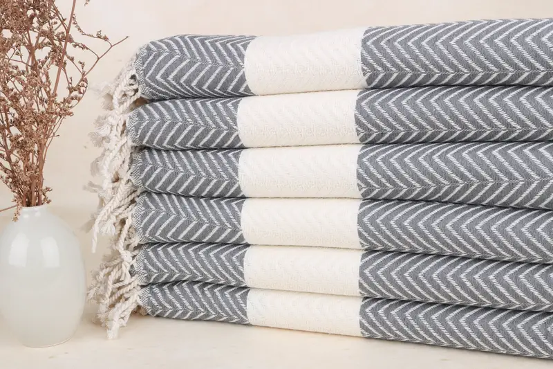 Crafted from 100% organic Turkish cotton, these beach towels ensure superior absorbency and softness. Characterized by a gentle hand-weaving process, they maintain precision with dimensions of 70x40 inches or 100x180 cm, with a manufacturing tolerance of 1-2.5 cm. Weighing 410 grams, they are lightweight yet robust.