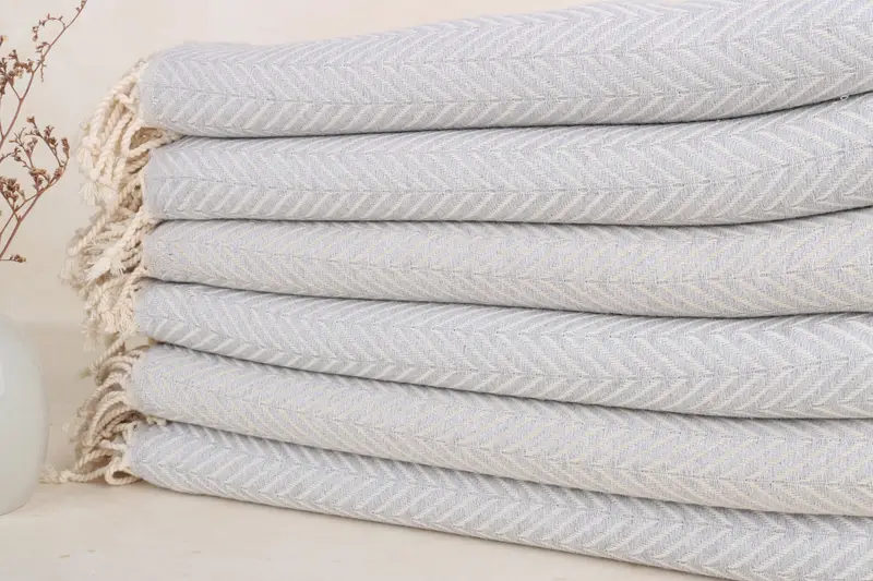 The 40"x71" light gray cotton towel is characterized by its soft, quick-dry, and lightweight nature. It is woven from 100% organic Turkish cotton, ensuring superior absorbency and a sand-free surface. The towel's dimensions are 70x40 inches or 100x180 cm, with a tolerance of 1-2.5 cm due to its handmade process. Its weight stands at 420 grams, ensuring it is both absorbent and space-saving.