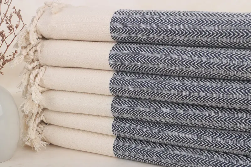 Turkish Beach Towels are woven with 100% organic Turkish cotton, ensuring optimal absorbency and a soft texture. Resulting in a towel of 67x36 inches or 90x170 cm, each piece weighs 420 grams and allows for a tolerance of 1-2.5cm in size due to its handmade nature. Customization options include embroidery with personal names, logos, dates, or initials, and these towels are pre-shrunk prior to shipping. Buyers should note that physical addresses and phone numbers are required for delivery, and international buyers must fulfill all import-related...